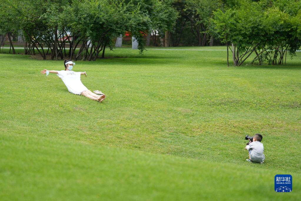 6月24日,市民在黑龍江省哈爾濱市湘江公園游玩、留影。