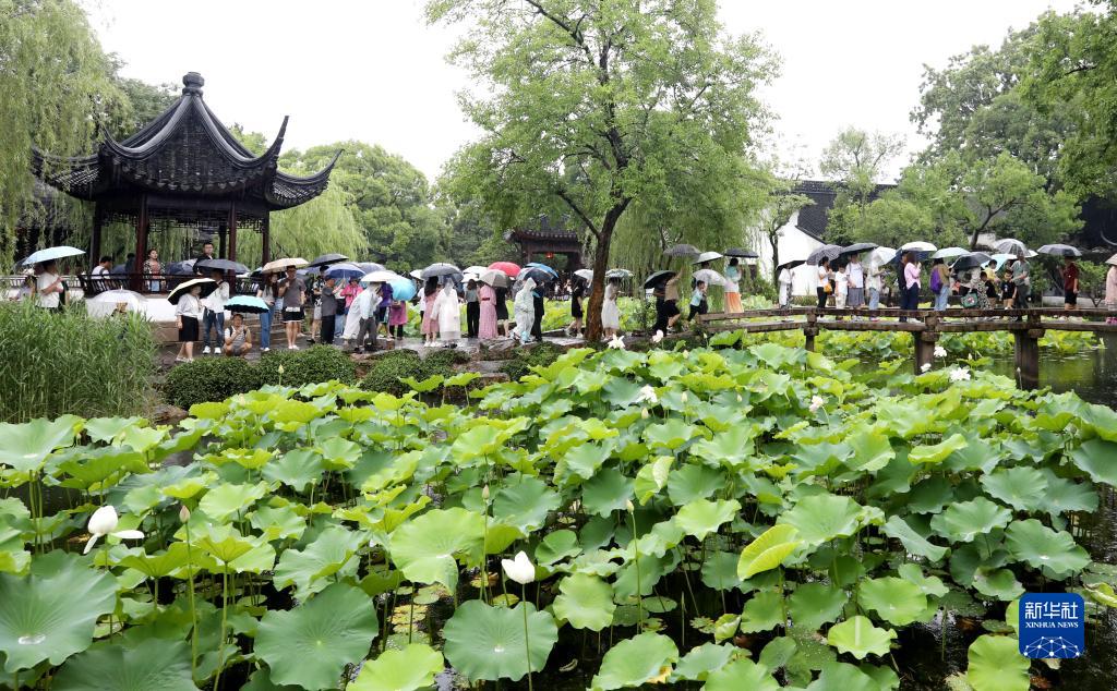 6月24日,在江蘇省蘇州市,游客在雨中游覽拙政園。