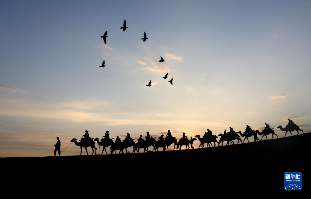 6月24日清晨,游客在甘肅省敦煌市鳴沙山月牙泉景區游覽。