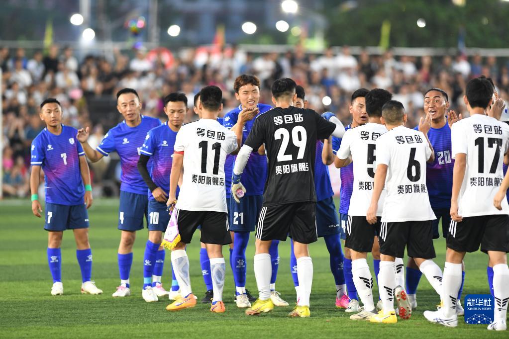 6月23日,貴州省榕江縣足球隊球員(前)與青海省果洛州格薩爾王足球隊在友誼賽前擊掌致意。