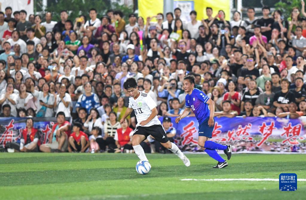 6月23日,貴州省榕江縣足球隊球員(左)與青海省果洛州格薩爾王足球隊球員在友誼賽中拼搶。