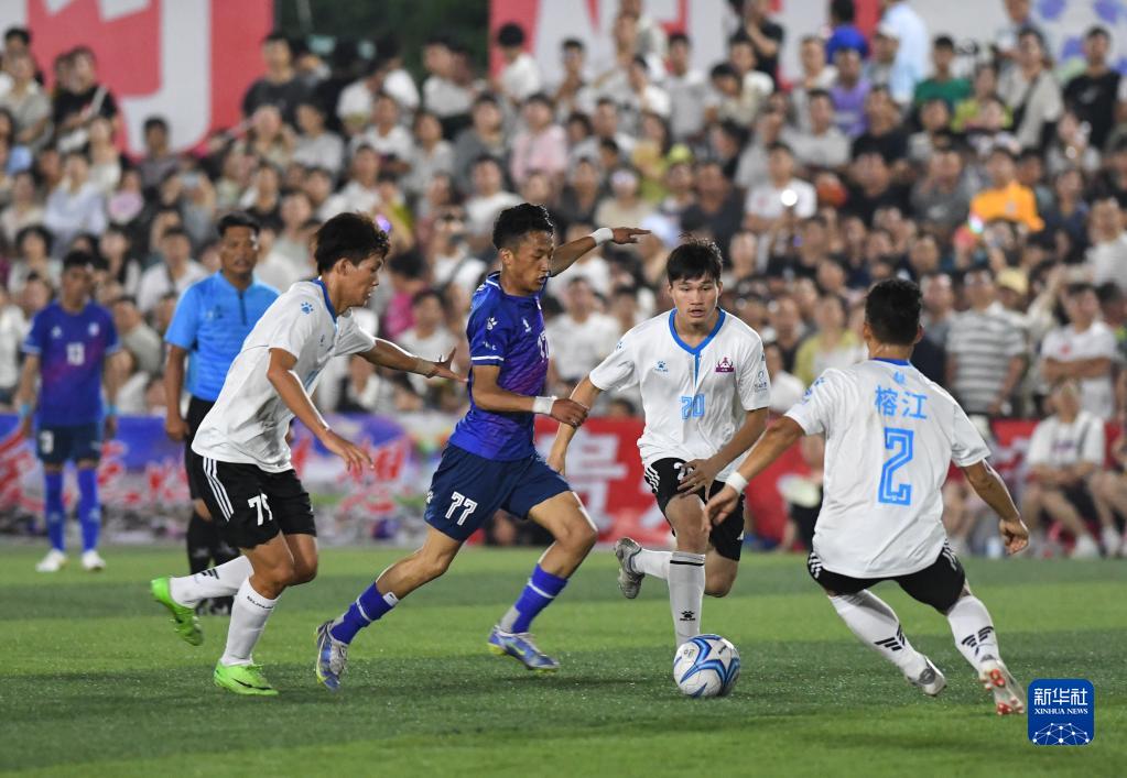 6月23日,貴州省榕江縣足球隊球員在與青海省果洛州格薩爾王足球隊的友誼賽中拼搶。