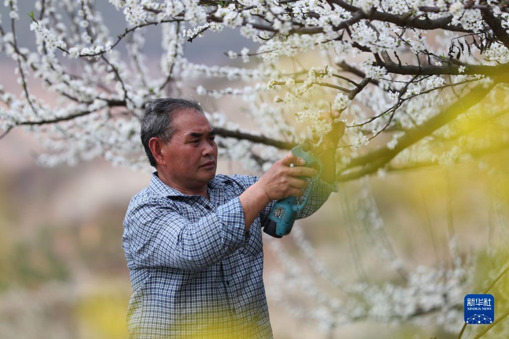 夏國剛在貴州省開(kāi)陽(yáng)縣龍水鄉龍溪村烏江河畔的果園為蜂糖李樹(shù)疏花(3月10日攝)。