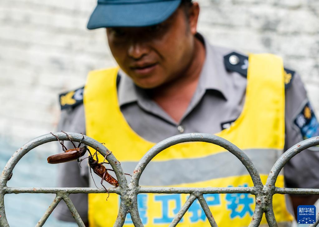 6月20日,落在欄桿上的兩只昆蟲(chóng)吸引了楊有光的目光。