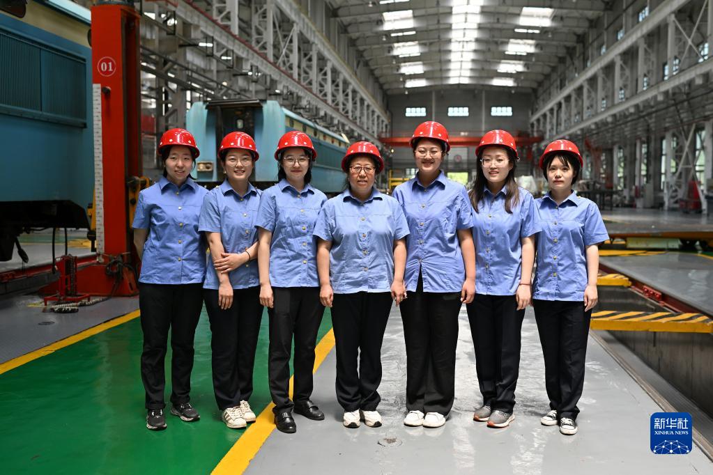 在中國鐵路太原局集團有限公司太原機務(wù)段太北檢修車(chē)間,動(dòng)力組的部分天車(chē)司機在車(chē)間合影(6月15日攝)。