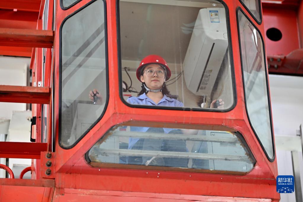 在中國鐵路太原局集團有限公司太原機務(wù)段太北檢修車(chē)間,天車(chē)司機王孟媛在天車(chē)上作業(yè)(6月20日攝)。