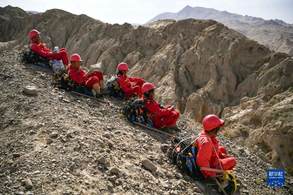 東方物探公司塔里木物探處2170隊放線(xiàn)班組的工人在運送檢波器途中休息(6月20日攝)。