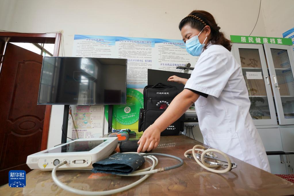 6月25日,河北省柏鄉縣十里鋪村衛生室村醫在出診前整理全科醫生助診包內的設備。