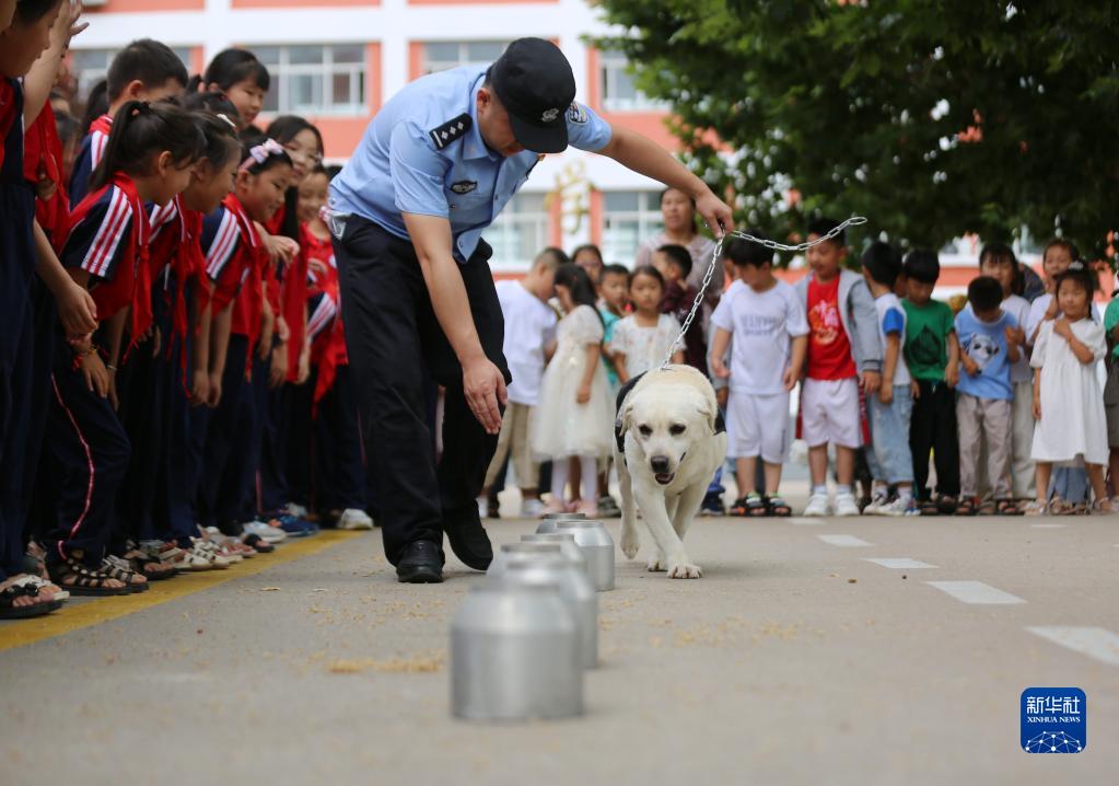 6月25日,山東省沂南縣公安局在辛集鎮中心小學(xué)開(kāi)展禁毒主題宣傳活動(dòng),給小朋友演示緝毒犬嗅毒。