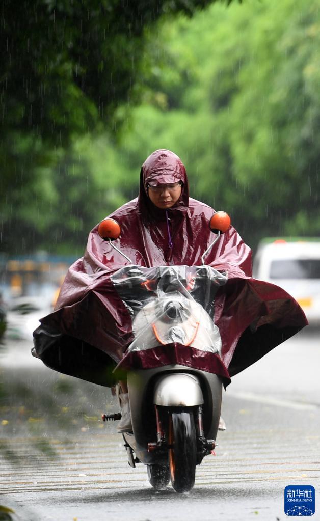 6月26日,在廣西南寧市濱湖路,市民冒雨出行。