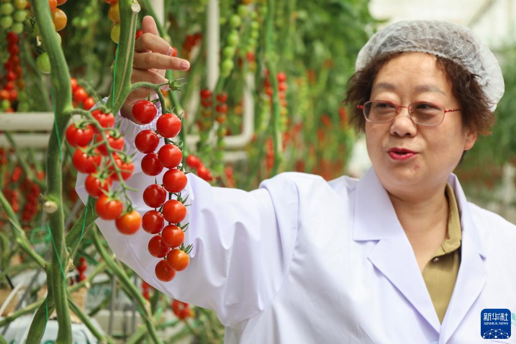 在張掖市民樂(lè )工業(yè)園內的一家農業(yè)公司,工作人員在查看串收番茄生長(cháng)情況(6月25日攝)。
