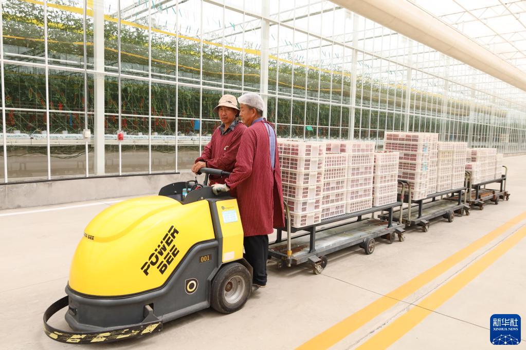 在張掖市民樂(lè )工業(yè)園內的一家農業(yè)公司,工作人員在運輸采摘好的串收番茄(6月25日攝)。