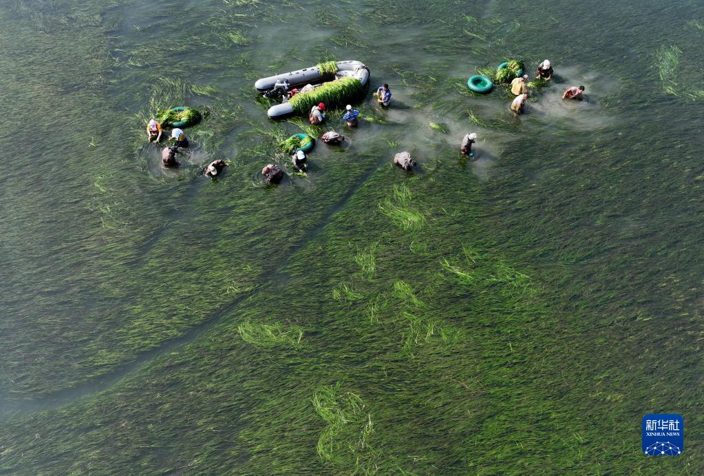 6月25日,中船環(huán)境集團的工人在唐山市曹妃甸區海洋生態(tài)保護與修復項目鰻草苗采集海域采集鰻草苗(無(wú)人機照片)。