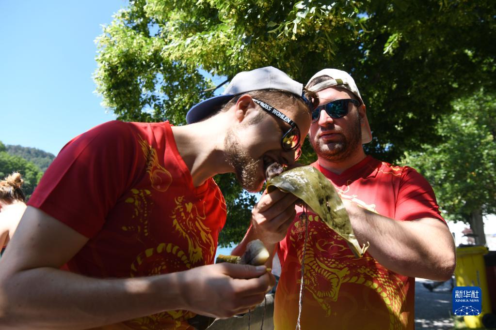 6月25日,在瑞士埃格利紹,人們在賽龍舟活動(dòng)上品嘗中國粽子。