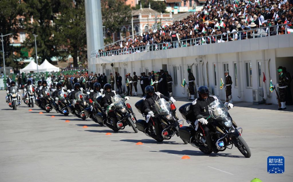 6月26日,在馬達加斯加首都塔那那利佛,馬達加斯加警察摩托車(chē)方陣接受檢閱。