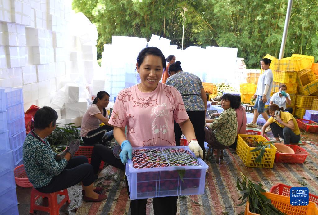 6月27日,廣西北流市北流鎮六行村村民在搬運荔枝。