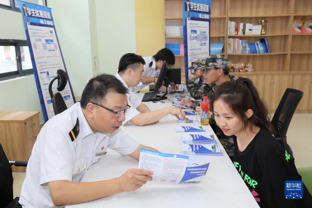 6月27日,鐵路上海站便民志愿服務(wù)團隊為上海健康醫學(xué)院學(xué)生介紹購買(mǎi)火車(chē)票的學(xué)生優(yōu)惠注意事項。