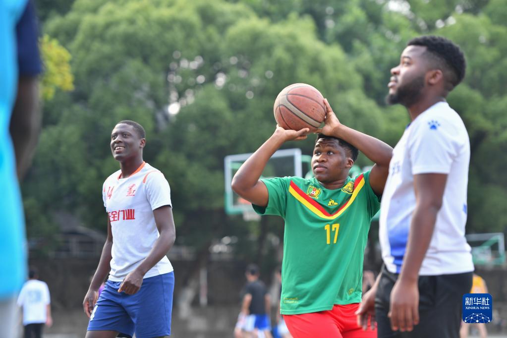 在中南大學(xué)體育場(chǎng),何?。ㄓ叶┖屯瑢W(xué)一起打籃球(6月14日攝)。
