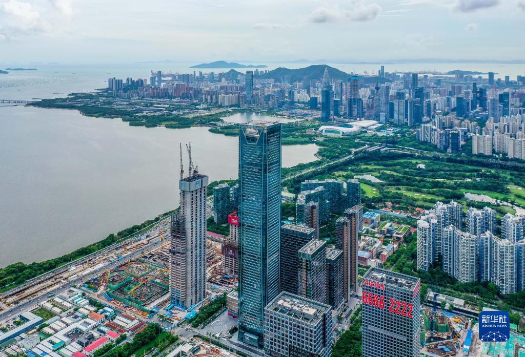位于深圳灣超級總部的深灣匯云中心(中)66層至79層是伍濤團隊在打造裝飾的一家國際著(zhù)名品牌酒店(無(wú)人機照片,6月26日攝)。