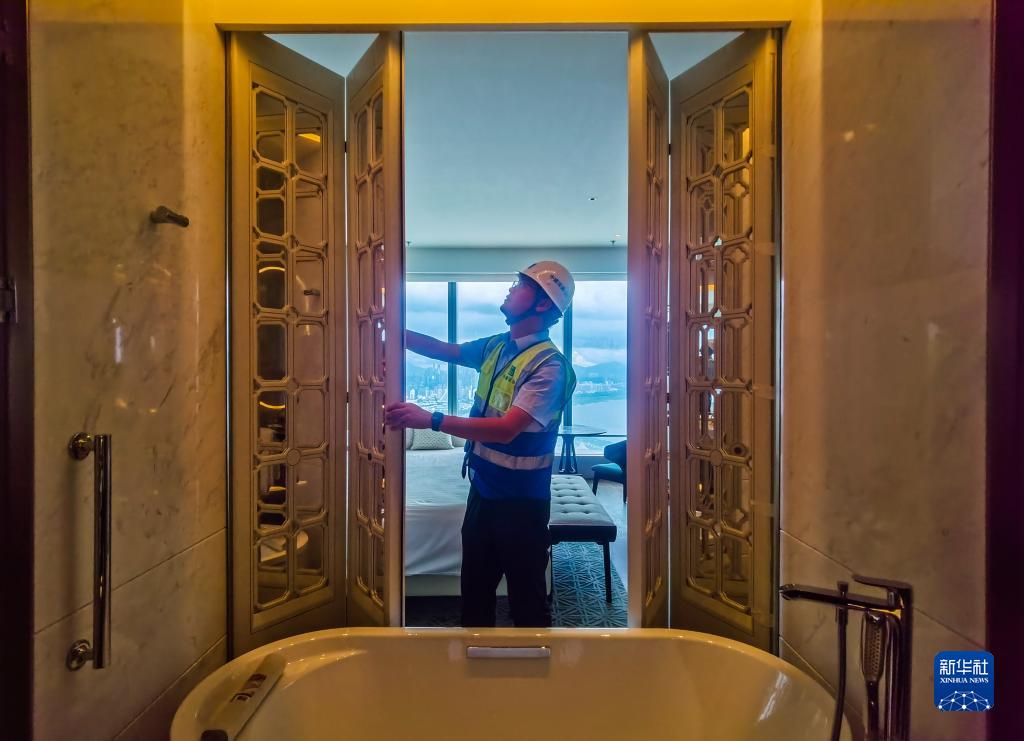 伍濤在客房檢查滿(mǎn)洲窗燭花玻璃折疊門(mén)的開(kāi)合順暢度(6月26日攝)。