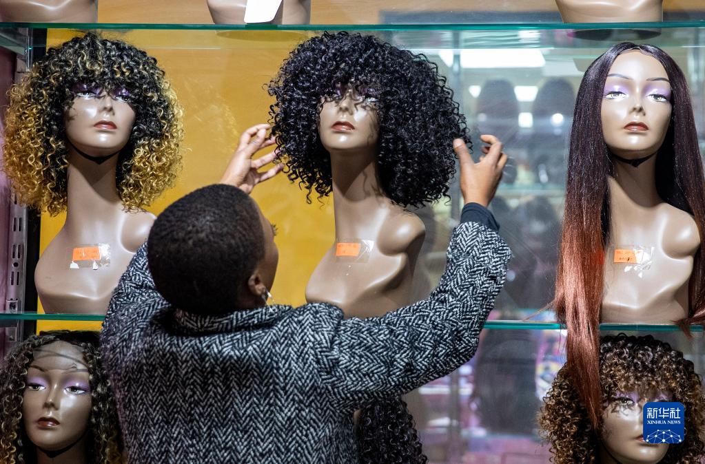 6月9日,在湖南邵陽(yáng)美麗來(lái)發(fā)制品有限公司位于南非約翰內斯堡的店鋪內,一名店員在整理展示的假發(fā)。