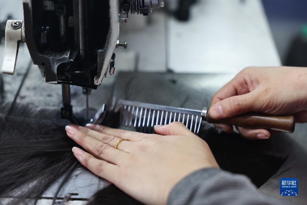 5月25日,工人在湖南邵陽(yáng)美麗來(lái)發(fā)制品有限公司車(chē)間內生產(chǎn)假發(fā)。