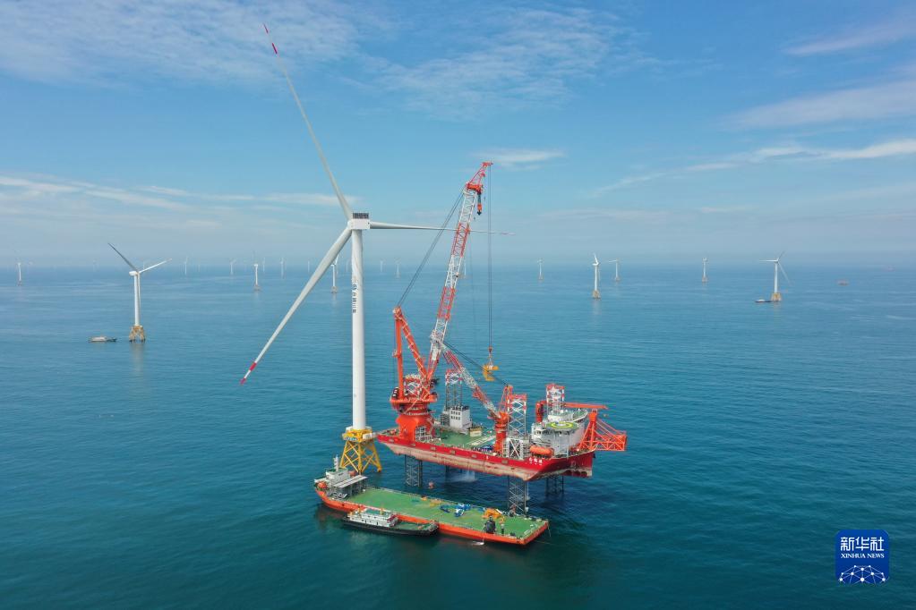 6月28日拍攝的全球首臺16兆瓦海上風(fēng)電機組吊裝現場(chǎng)(無(wú)人機照片)。