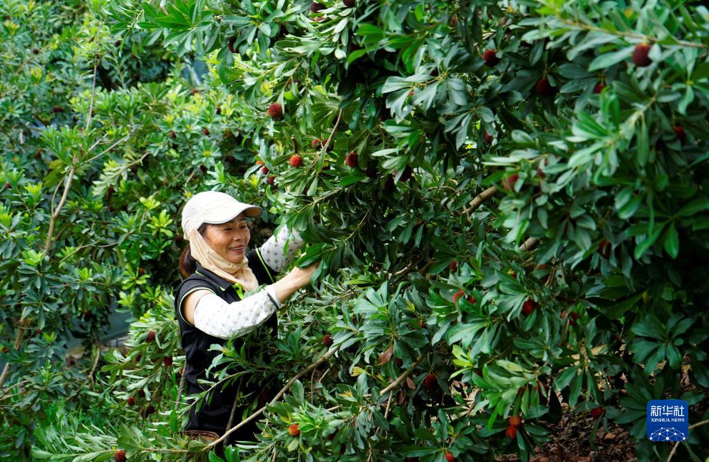 湖南省靖州苗族侗族自治縣渠陽(yáng)鎮官團村的果農采摘楊梅(6月18日攝)。