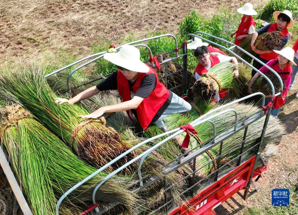 6月28日,在湖南省衡陽(yáng)市祁東縣金橋鎮,南華大學(xué)電氣工程學(xué)院的志愿者將收割的藺草裝車(chē)(無(wú)人機照片)。