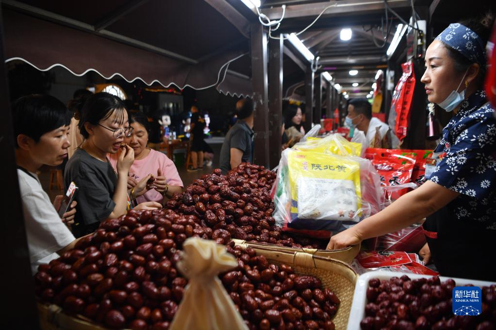 6月28日,游客在延安市延州二道街夜市選購陜北特產(chǎn)。