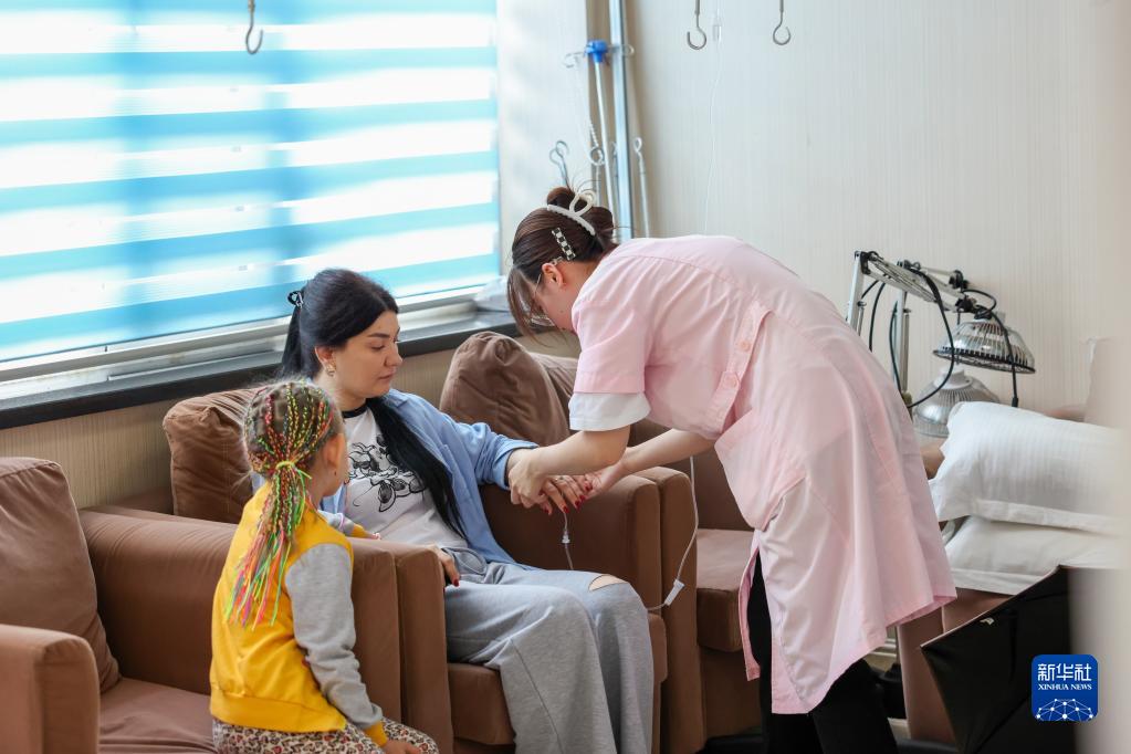 6月28日,在琿春市一家醫院,護士為俄羅斯患者輸液。
