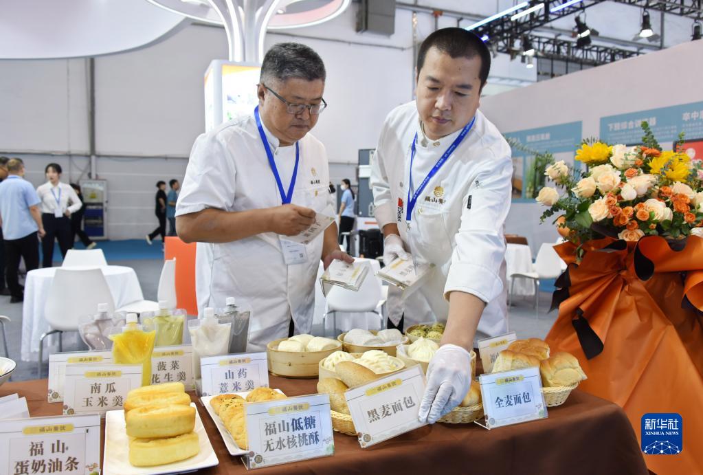 6月29日,一家參展企業(yè)工作人員在展會(huì )上展示特色面點(diǎn)。