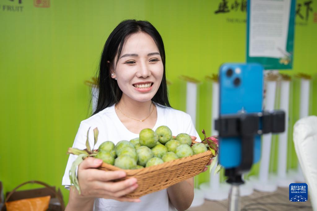 6月28日,在巫山脆李第七屆開(kāi)園節暨中國郵政航空“脆李航班”啟航儀式活動(dòng)現場(chǎng),一名主播在直播售賣(mài)巫山脆李。