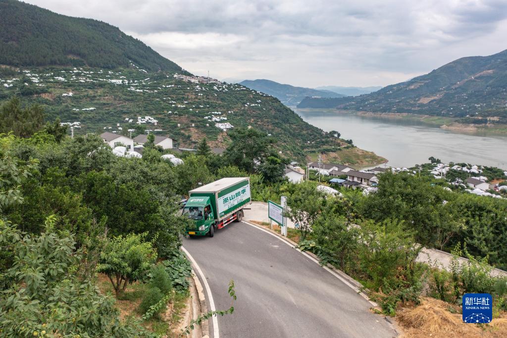 6月28日,在重慶市巫山縣曲尺鄉柑園村,裝載巫山脆李的中國郵政物流車(chē)行駛在村內(無(wú)人機照片)。