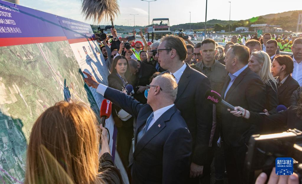 6月28日,塞爾維亞首都貝爾格萊德,塞爾維亞總統武契奇(中)在中企承建的貝爾格萊德繞城高速公路路段通車(chē)儀式現場(chǎng)觀(guān)看展板。