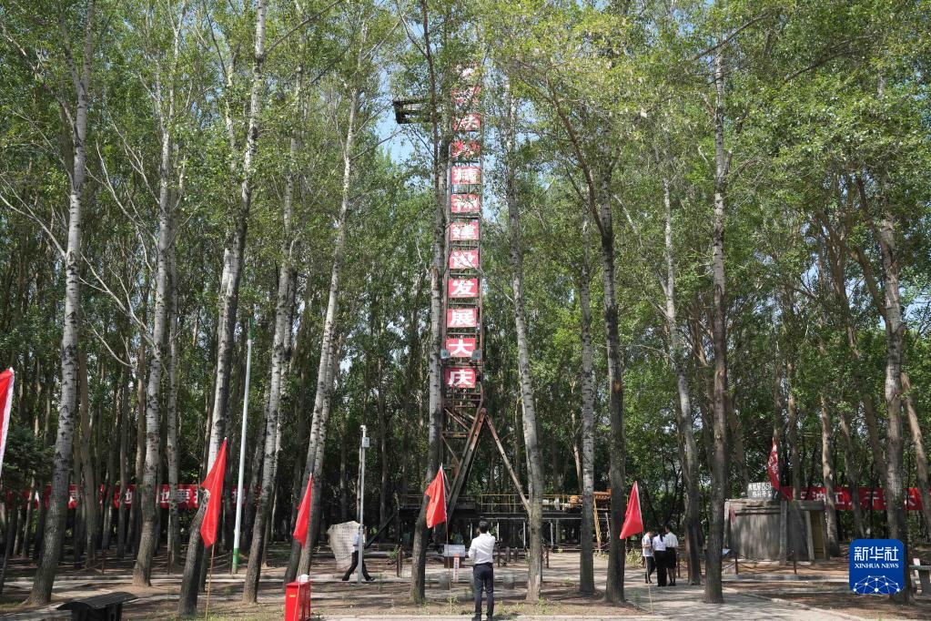 6月28日,參觀(guān)者在大慶油田鐵人一口井教育培訓基地觀(guān)看鉆井架。