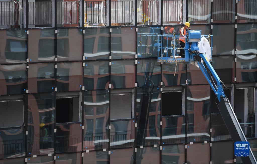 6月29日,在中建三局承建的西安電子科技大學(xué)廣州研究院項目工地,工人在高空作業(yè)。