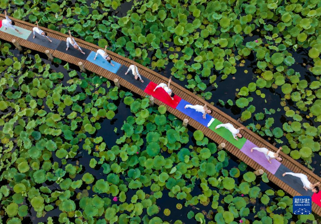 6月21日,瑜伽愛(ài)好者在江蘇泰州天德湖公園荷花池棧橋上練瑜伽(無(wú)人機照片)。