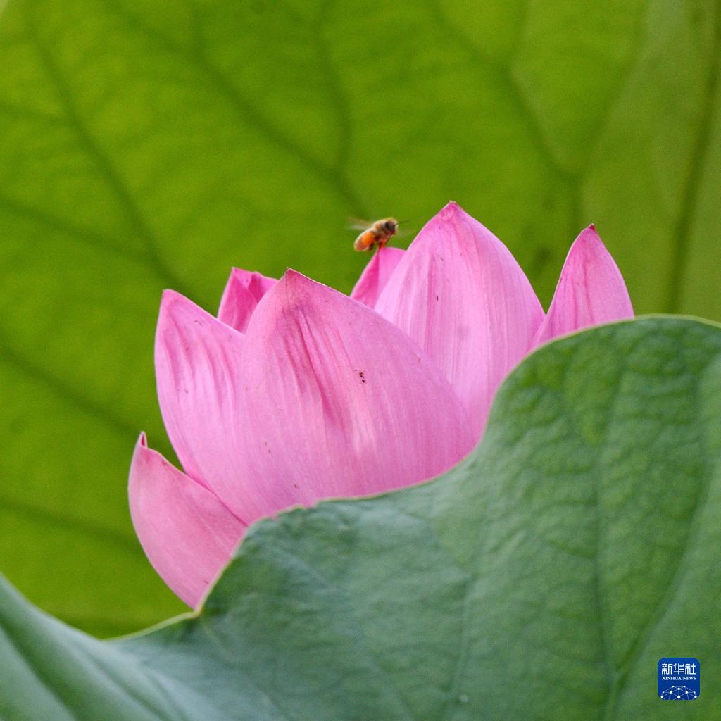 6月21日,在河北省石家莊市欒城區人民公園荷塘,一只蜜蜂落在盛開(kāi)的荷花上。