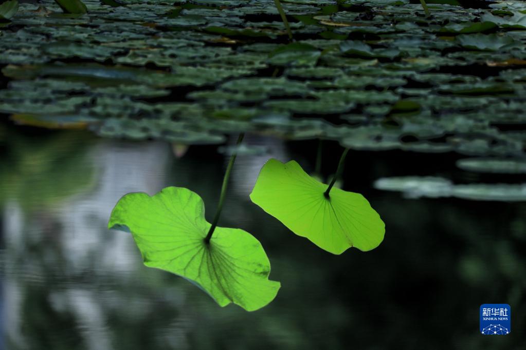 6月18日在浙江舟山普陀田園綜合體一處水池里拍攝的荷葉倒影。