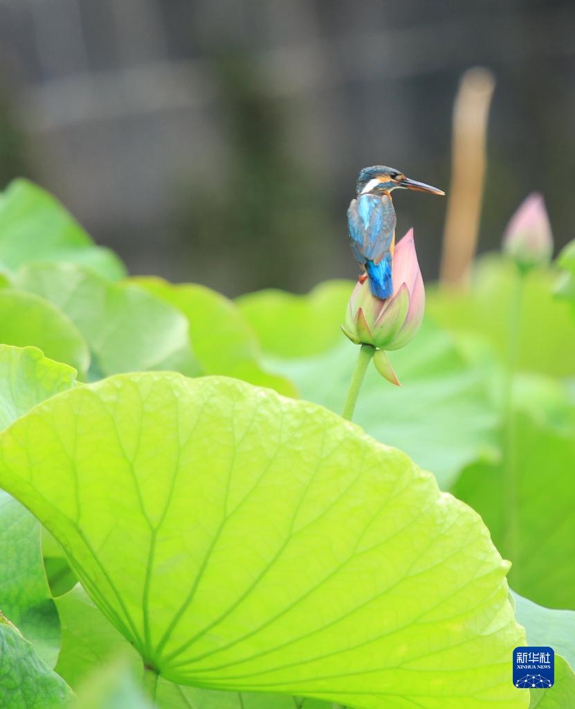 6月13日,在云南省騰沖市荷花鎮雨傘村荷花池,一只翠鳥(niǎo)立在荷花上。