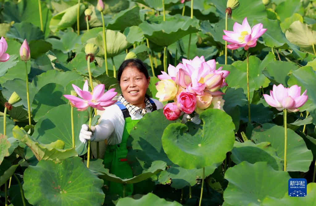 6月26日,四川省眉山市仁壽縣方家鎮水池村村民在荷田采收荷花。