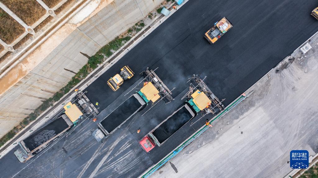 6月29日,中鐵十二局工人在貴金古高速公路清池至古藺段進(jìn)行路面施工(無(wú)人機照片)。