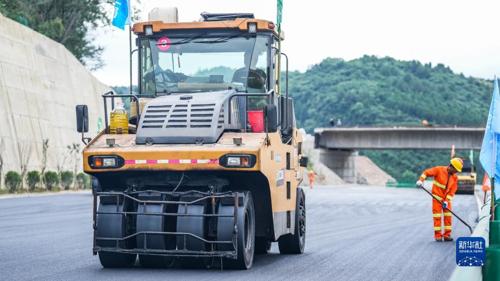 6月29日,中鐵十二局工人在貴金古高速公路清池至古藺段進(jìn)行路面施工。