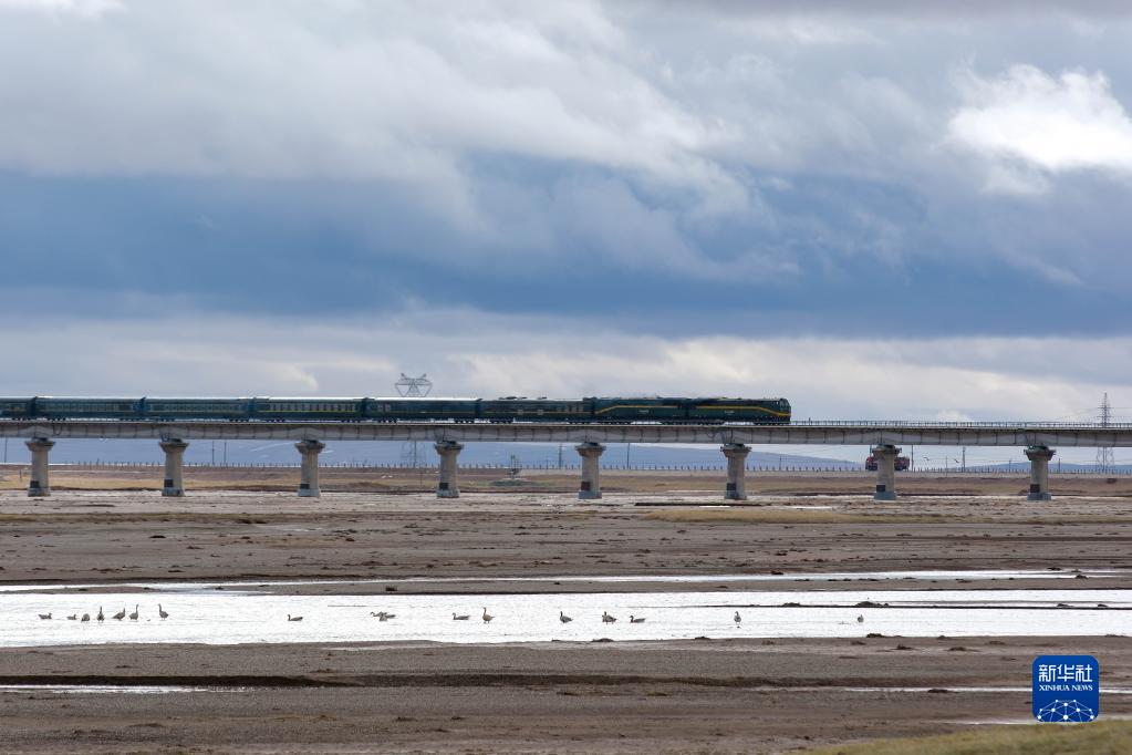 6月15日,一列火車(chē)駛過(guò)長(cháng)江源地區的沱沱河。新華社記者張鋮攝