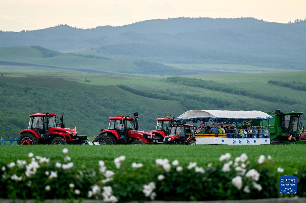 6月28日,游客在額爾古納市蒙兀室韋蘇木境內的奧洛契莊園乘車(chē)游覽。