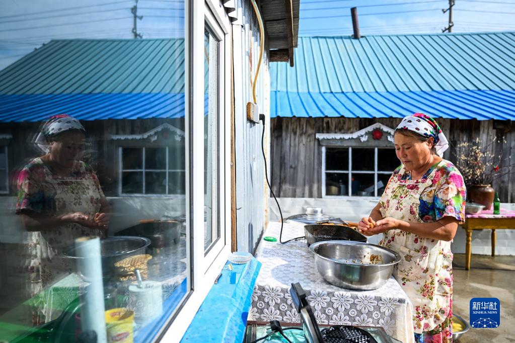 6月28日,考占花在制作肉餅??颊蓟ㄊ嵌砹_斯族,2004年開(kāi)始經(jīng)營(yíng)俄羅斯族家庭游。