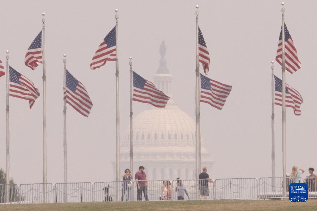 6月29日,在美國首都華盛頓,游客在華盛頓紀念碑游覽,遠處的國會(huì )大廈籠罩在煙霧中。
