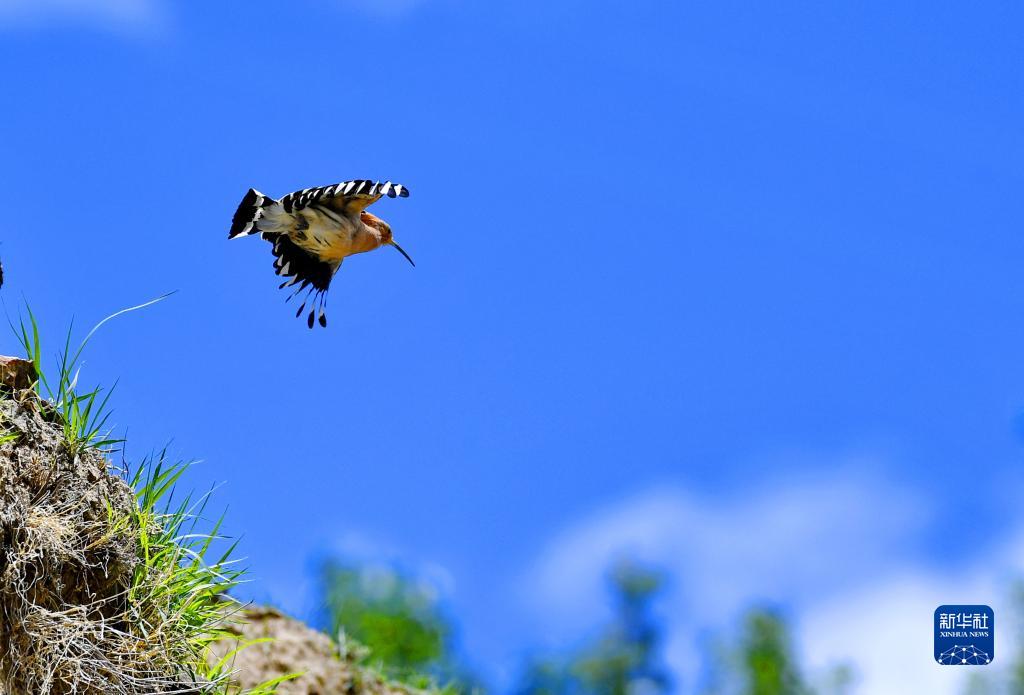 戴勝在白定村上空飛翔(6月29日攝)。