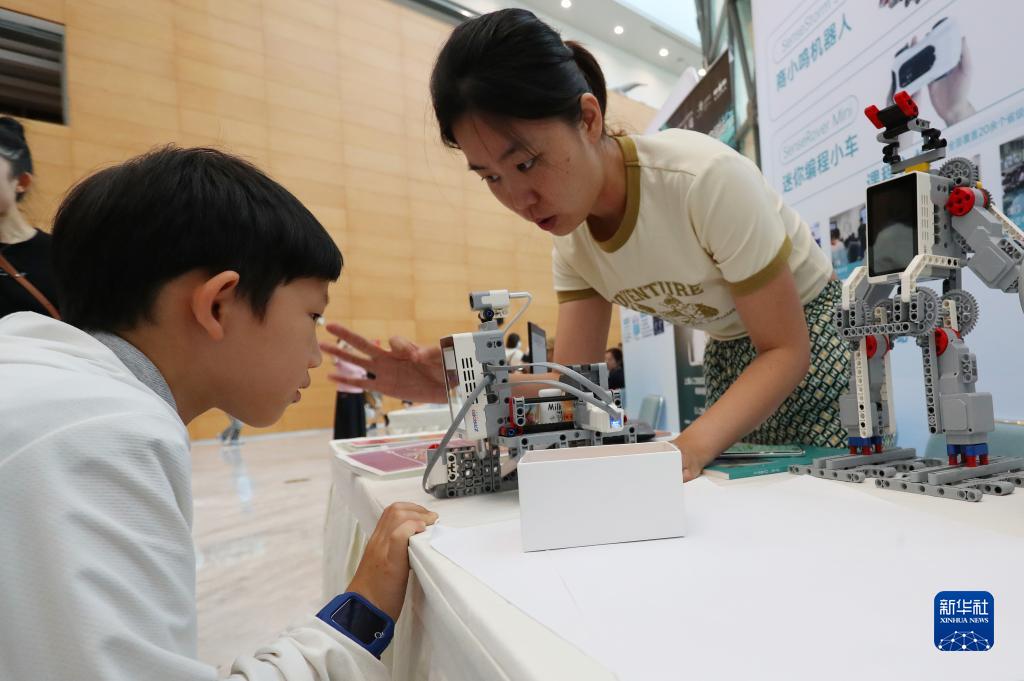 6月30日,工作人員(右)在上海自然博物館內舉行的“科創(chuàng )教育集市”上向小朋友介紹一款帶有編程功能的圖像識別裝置。